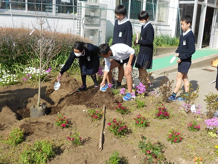 6年生が半年かけて取り組んできた「卒業サプライズ大作戦」の残金を使って、ハナミズキの苗木を2本購入しました。ピンクの花と白の花が咲く苗木を、保健室の前と職員室の前に植えました。6年生全員で、大きく育つようにと心を込めて、土をかぶせました。小さい苗木ですが、つぼみがついており、いつ花開くか楽しみです。