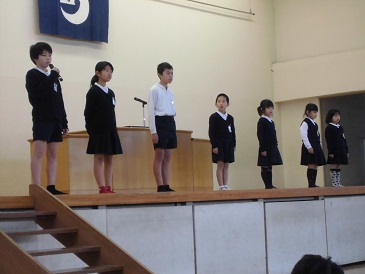 1年生から5年生の修了式が行われました。始めに、各学年の代表者が校長先生から修了証を受け取りました。その後、2年生と5年生の代表者が、後期で頑張ったことやこれから頑張りたいことを発表しました。校長先生の講話では、「一つ上の自分になるために、素敵な言葉が使えるようになりましょう。」という話がありました。生徒指導担当からは、「は・な・み」という言葉で、「はなしをします。お金やお店の使い方。」「なくすな命。自転車の乗り方に気を付けます。」「みんなの迷惑になることはしません。落書きや火遊び」について話がありました。また、保健担当からは、「あ・い・す」という言葉で、「あさご飯」「いつもと同じ時間」「すききらいをしない」など健康について話がありました。最後に、一年間お世話になった浅野先生に、お別れと感謝の言葉を伝えました。ありがとうございました。
