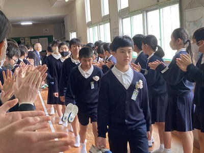 また、5年生はオンラインで卒業式の様子を参観し、卒業生が体育館から教室に戻るまでの花道をつくりました。