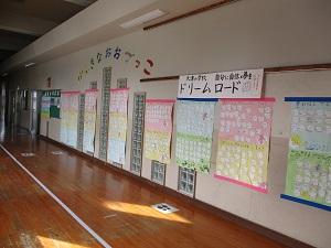 大津小の児童1人1人の夢をみんなに紹介する「夢応援プロジェクト」の取組がありました。これは、「大津小の子どもたちに夢をもって欲しい。そして、その夢をみんなで共有したい。」という児童会役員の子どもたちの選挙公約の1つから生まれたものです。子どもたち1人1人の夢は中央廊下に掲示され、その廊下は「ドリームロード」と名付けられました。