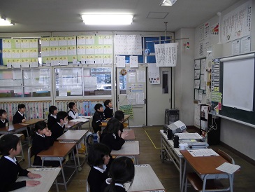 来年度、入学予定の6年生が、大津中学校へ体験入学に行きました。まず、体育館で保護者と一緒に中学校の生徒指導担当の先生や生徒会役員の生徒から、中学校の生活や学習について説明して頂きました。次に、6年生は3つの教室に分かれ、中学校の英語、理科、社会の授業を体験しました。