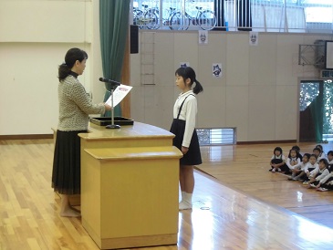 後期始業式では、まずボランティア委員会の表彰がありました。ペットボトルキャップを85㎏集めて、イオン九州に届けました。大津小学校で集めたペットボトルキャップは、21人分のポリオワクチンに変えることができます。ボランティア委員会の取り組みに感謝状を頂きました。