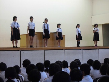 3年生と6年生の代表の子どもたちが、後期に頑張りたいことを発表しました。6年生は卒業まであと半年です。自分のため、学級のため、学校のために頑張りたいという思いを発表しました。