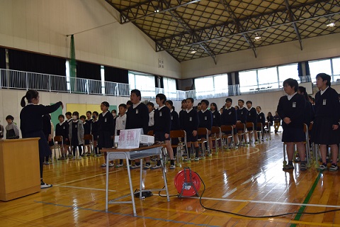 「熊本子どもの美術展」特選作品の表彰と、バスケットボール部・サッカー部の表彰がありました。その後、旧児童会役員から一年間を振り返っての感想と、新児童会役員から就任のあいさつがありました。これからは、新児童会役員が大津小学校を引っ張っていきます。旧児童会役員さん、大津小学校のために頑張ってくれてありがとうございました。一年間お疲れ様でした。
