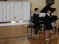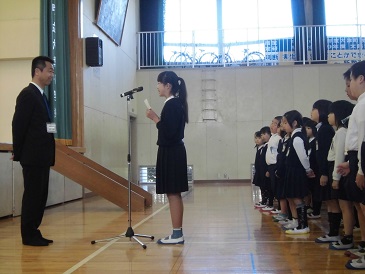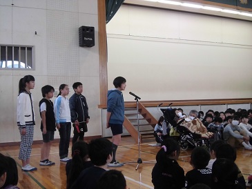 1年生から5年生の修了式が行われました。始めに、各学年の代表者が校長先生から修了証を受け取りました。その後、2年生と5年生の代表者が、後期で頑張ったことやこれから頑張りたいことを発表しました。校長先生の講話では、「一つ上の自分になるために、素敵な言葉が使えるようになりましょう。」という話がありました。生徒指導担当からは、「は・な・み」という言葉で、「はなしをします。お金やお店の使い方。」「なくすな命。自転車の乗り方に気を付けます。」「みんなの迷惑になることはしません。落書きや火遊び」について話がありました。また、保健担当からは、「あ・い・す」という言葉で、「あさご飯」「いつもと同じ時間」「すききらいをしない」など健康について話がありました。最後に、一年間お世話になった浅野先生に、お別れと感謝の言葉を伝えました。ありがとうございました。