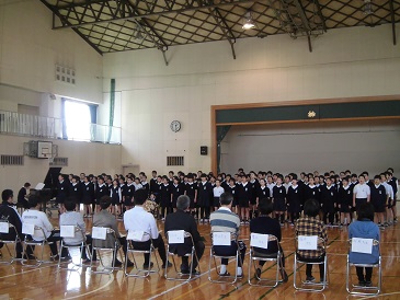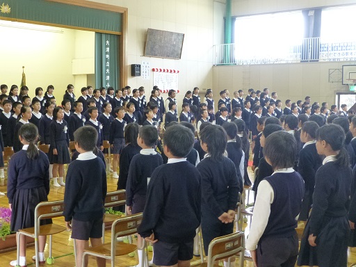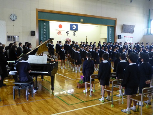 平成27年度大津小学校卒業式が行われ、卒業生110名が卒業証書を受け取りました。今年の「別れの言葉」は、卒業生が歌のパート(ソプラノ・アルト・マーレ)ごとに並び直し、保護者や在校生、先生方、地域のみなさんへ言葉と歌を送りました。今年は、「証」「仰げば尊し」「旅立ちの日に」を歌いました。また、「旅立ちの日に」は、卒業生が主旋律を歌い、在校生が副旋律を歌い、素晴らしい二部合唱となりました。最後の卒業生退場の場面では、卒業生全員で保護者をぐるっと囲むように並び、ありがとうございましたと感謝の気持ちを伝えました。思い出に残る感動的な卒業式になりました。