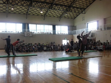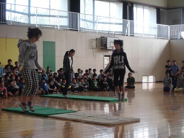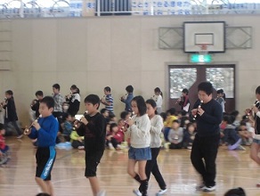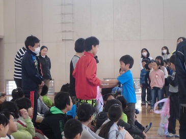 新旧児童会交代式の後に、6年生を送る会が行われました。器楽部の演奏から始まり、4年生のリコーダーの演奏と言葉、1年生からのプレゼントと歌、2年生からのクイズと歌、3年生のアンケート結果と楽器の演奏がありました。5年生からは、6年生への挑戦状ということで、尻相撲・フラフープ回し・縄跳び(二段跳び)の対決がありました。結果は2勝1敗で6年生が勝つことができました。さすが6年生という姿と、5年生の頼もしい姿が見られました。最後に6年生からは、卒業式で歌う「証」を歌いました。どの学年も素晴らしい発表で、思い出に残る送る会になりました。