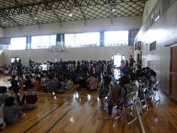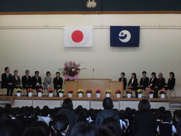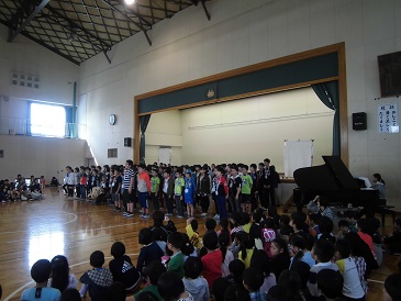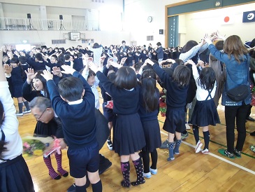 退任式が行われ、13名の先生方とお別れをしました。先生方から大津小での最後の話をして頂きました。児童代表がお別れの言葉を送り、PTAよりお別れの言葉と花束が先生方に送られました。最後に器楽部の演奏に合わせて、全校児童でアーチをつくり、見送りました。13名の先生方、ありがとうございました。