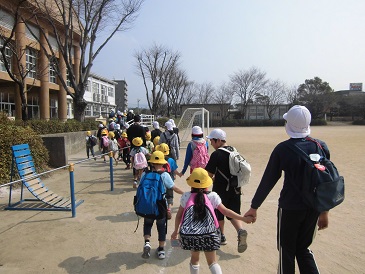 6年生を送る会が終わった後に、スポーツの森運動公園に遠足に出かけました。行きは6年生と1年生が手をつなぎ歩きました。しりとりやテレビの話などをしながら楽しそうに歩いていました。天気にも恵まれ、子どもたちは広場でたくさん走り回って遊んでいました。6年生は小学校最後の遠足を楽しんでいました。