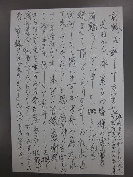 熊本大地震が起きた後、大津小学校へ永野悦子さんから電話がありました。大津小学校の子どもたちが大丈夫なのか心配してくださいました。そのことを卒業した子どもたち(現中学1年生)に伝えると、永野悦子さんへのお礼のお手紙を書きました。卒業生は、自分たちでお礼のお手紙を集めて小学校へ持ってきました。そのお手紙を小学校から永野悦子さんへ送りました。