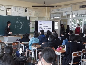 来年度、入学予定の6年生が、大津中学校へ体験入学に行きました。まず、体育館で保護者と一緒に中学校の生徒指導担当の先生や生徒会役員の生徒から、中学校の生活や学習について説明して頂きました。次に、6年生は3つの教室に分かれ、中学校の英語、理科、社会の授業を体験しました。
