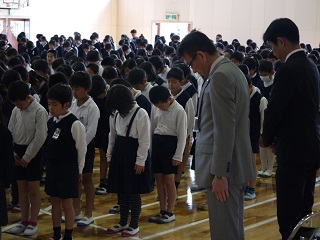 今日は就任式がありました。新しく大津小にやってきた先生にみんな興味津々です。