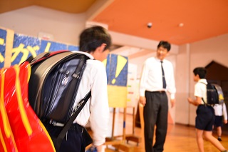 今日の学校の様子です。校長先生が昇降口に立ち、子どもたち一人一人に挨拶をしています。