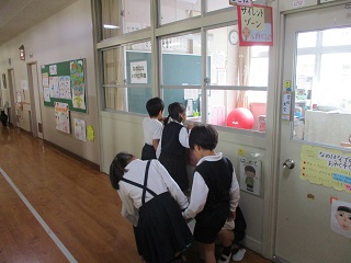 今日は1年生の子どもたちが、2年生のお兄さんお姉さんに連れられて、学校たんけんをしました。
