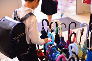 児童玄関へ行ってみると。傘をきちんと巻いてきれいに傘立てに立てる子どもたちの姿が見られました。