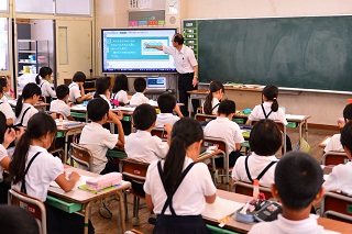 算数の授業の様子です。電子黒板に映し出された問題をみんなで解きます。