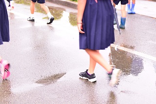 中には雨を楽しみ、長靴で水たまりを歩いてくる子どもの姿もみられます。
