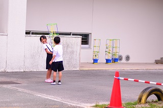 朝から朝顔のお世話をする1年生の姿が見られました。