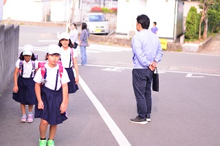 雨の中、学校にやってきた子どもたちを校長先生が迎えます。