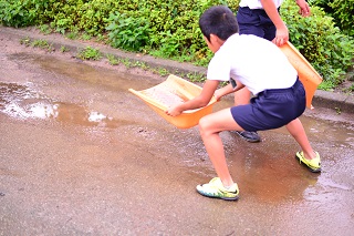 今日は雨でたまった泥をすくい出している子どもたちの姿も見られました。