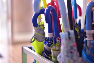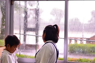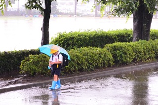 中には雨を楽しみ、長靴で水たまりを歩いてくる子どもの姿もみられます。
