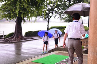 雨の中、学校にやってきた子どもたちを校長先生が迎えます。