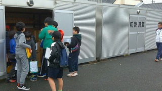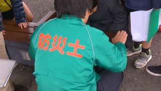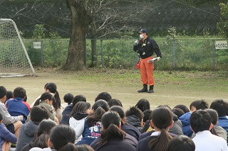 今日は火災避難訓練がありました。消防署の方に避難のやり方についてのお話をしていただいています。