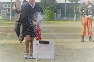 水消火器も使いました。代表の子ども防災士と先生で消火器の練習をしました。
