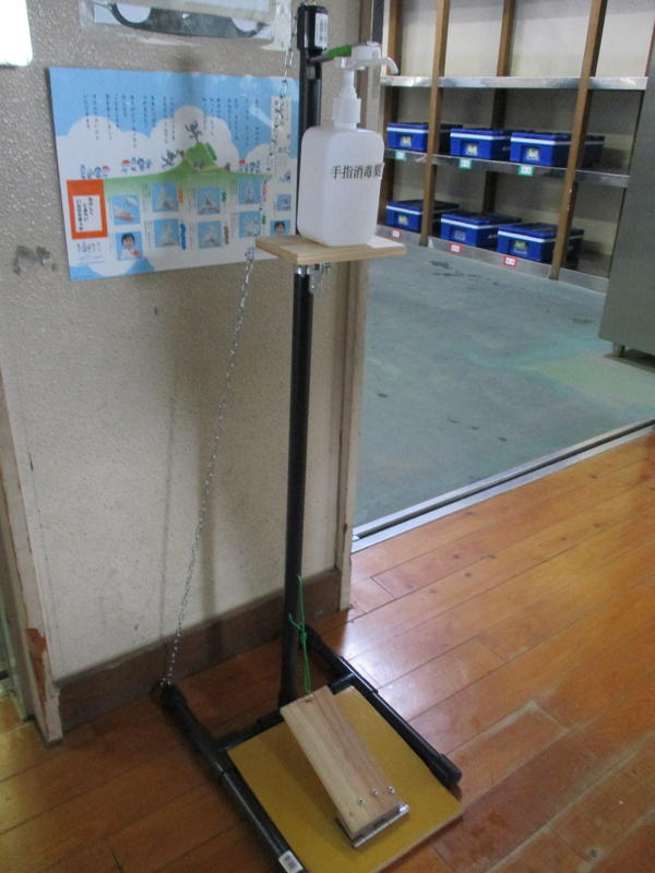 給食室前、職員室前、玄関に登場しました!「足踏み式手指消毒機」です!!