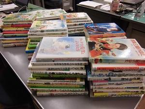 PTA会長の水島さんから図書の寄贈をいただきました。物語、絵本、図鑑など様々なジャンルの本を70冊。低学年から高学年まで、どの学年の児童も手にとって読める本ばかりです。