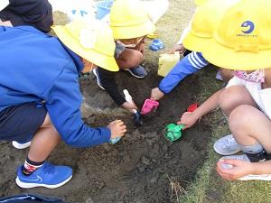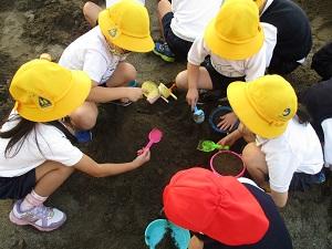 ある秋の日の1年生の図工の学習中の様子です。砂の感触を味わいながら、友だちと仲良く活動をしていました。友だちに自分の考えを伝えながら、協力して大きな山や長い川を作ることができ、満足そうでした。