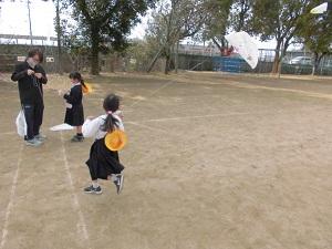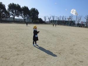 1年生が生活科の学習で昔遊びに挑戦しています。この日は外で凧揚げをしていました。お気に入りの絵を描いた自分の凧を空高く揚げ、満足そうな様子でした。凧揚げの他にもぶんぶんゴマ、けん玉、めんこ、竹とんぼなど様々な遊びを体験し、楽しく昔遊びに親しんでいます。
