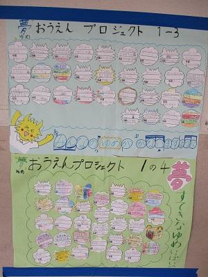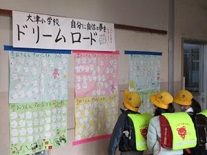 大津小の児童1人1人の夢をみんなに紹介する「夢応援プロジェクト」の取組がありました。これは、「大津小の子どもたちに夢をもって欲しい。そして、その夢をみんなで共有したい。」という児童会役員の子どもたちの選挙公約の1つから生まれたものです。子どもたち1人1人の夢は中央廊下に掲示され、その廊下は「ドリームロード」と名付けられました。