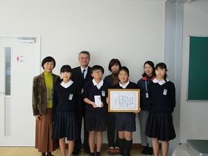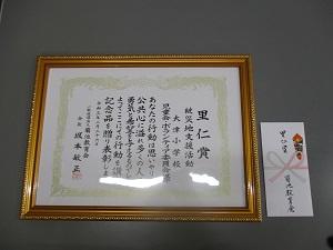 里仁賞とは、論語、里仁第四の第一章にある言葉に基づき、人の模範になる行いをしている人、団体を表彰するものです。令和2年7月豪雨に対する募金活動等の取組が認められ、今回大津小学校が受賞しました。学校を代表して児童会とボランティア委員会の子どもたちが、大津町教育委員会の吉良教育長から賞状と記念品を受け取りました。吉良教育長が低学年のころの校長先生だったこともあり、とてもうれしそうな様子の子どもたちでした。