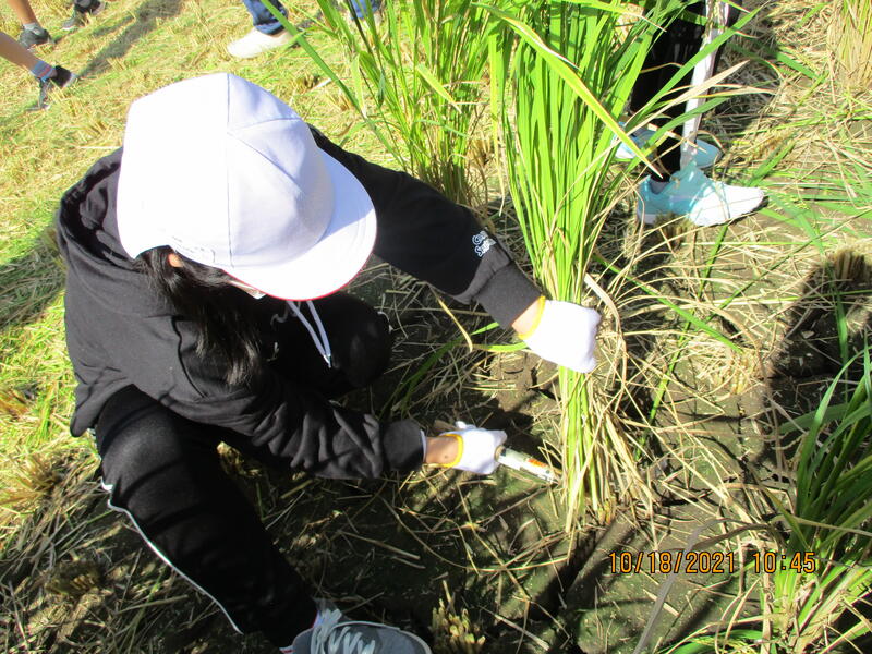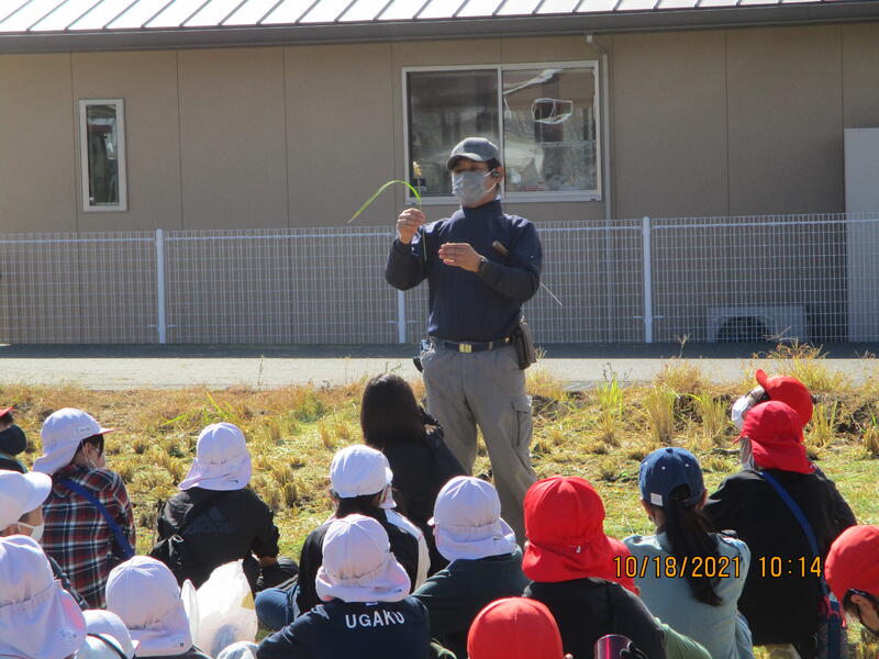 5年生が6月に田植えをした稲が収穫の時期を迎えました。田植え体験でお世話になった坂本静明さんに再びご協力いただき、稲刈りをしました。