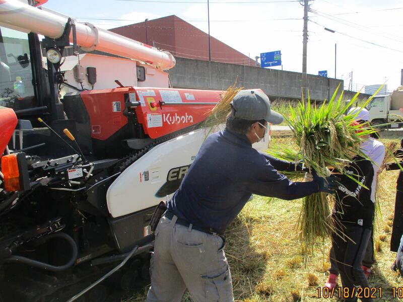 稲の束をつかみ、鎌を使って刈り取っていきます。後半は、コンバインに稲を運んで脱穀のお手伝いもしました。とても貴重な体験をさせていただき、本当にありがとうございました。