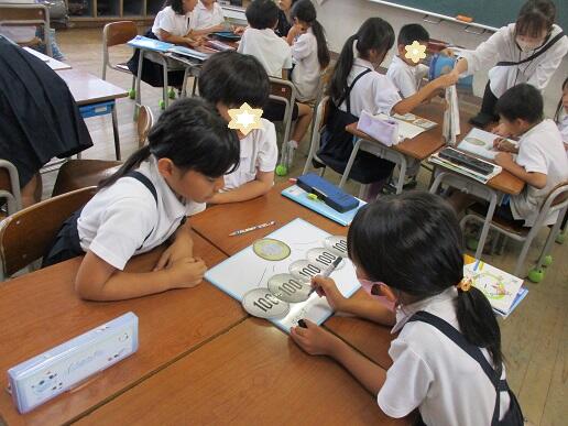 大きな100円玉を並べて、あれこれ考えているグループもありました。