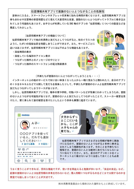 夏休みに入りました。位置情報共有アプリ以外にも、画像のSNS等へのアップすることも気をつけたいところです。