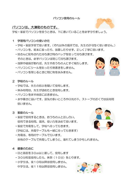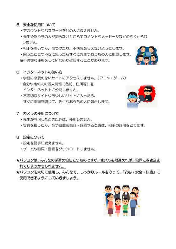 つきましては、学校では教育用パソコンの取り扱いについて、次の「パソコン使用のルール」とあわせて、取り扱いに注意することを5点指導しています。