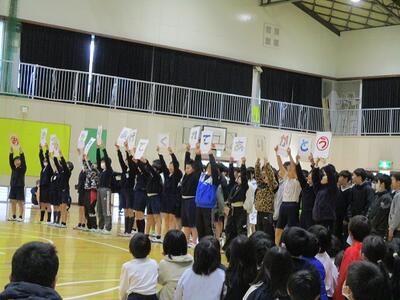 大津東小、大津南小、大津小合わせて約170名の子どもたちが、大津小の体育館に大集合。