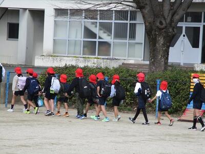 この後、大津町民グランドへ出発。6年生が1年生を、5年生が2年生の手をつないで出かけました。