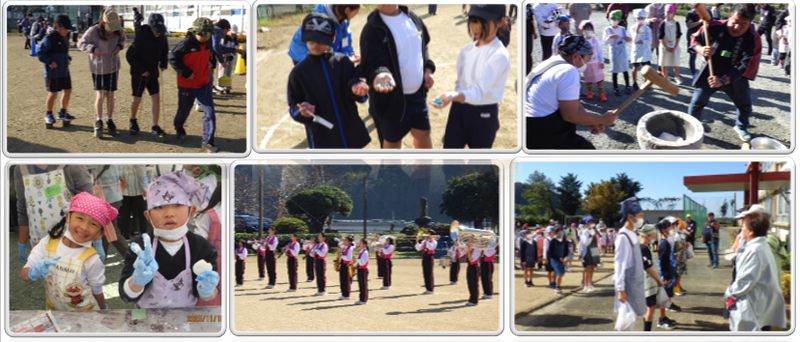 フェスタでは、先ず校庭で昔遊びが行われました 。お手玉やビー玉などたくさんのコーナーにわかれ、地域の方に教えていただきながら楽しむことができました。続いて、みんなで収穫したもち米を使った餅つき。子どもたちもおうちの方と力を合わせてぺったんこ!つきあがったお餅はアツアツのうちにみんなで丸めました。また、今年は大津中学校吹奏楽部による演奏があり 、生のカッコいい演奏にみんな大喜び。お昼は、つきたてのお餅と豚汁で心もお腹も満たされました。午後からは、もち米「子ども米」の販売やバザー、親子レクのモルックが行われ 、大盛況のうちに終了となりました 。ご参加、ご協力くださったすべての皆様に心より感謝申し上げます。