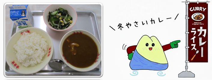 今日は、みんな大好きカレーライスです!12月に入り、寒くなってきたので、しっかりと体を温めましょう。このカレーには、だいこんやれんこんなど、冬が旬の野菜がたっぷり入っています。放送当番さんからも「レンコンが入っていて美味しかったです」と冬野菜についてコメントがありました!しっかり食べて、風邪に負けない元気な体を作りましょう(^_^)b