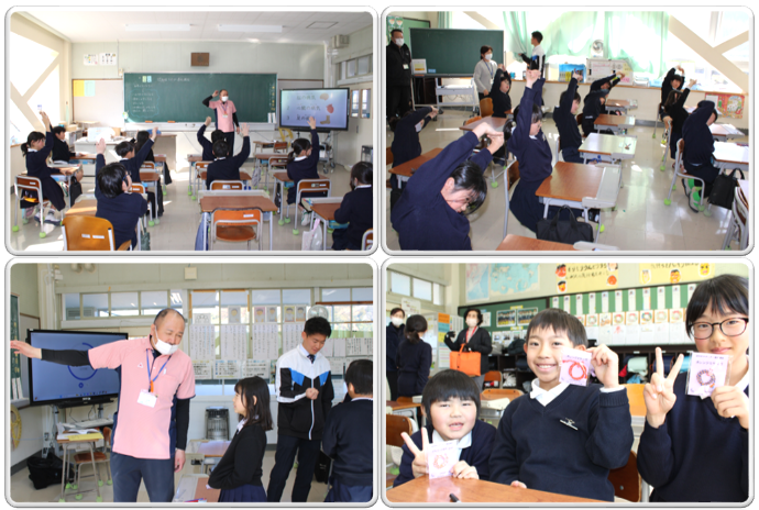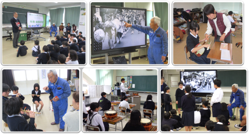 冒頭、校長から昭和の歴史写真集に掲載されている牛舞いの写真が紹介されました。子どもたちは昔から続く牛舞の歴史に興味津々。保存会の宮崎様からも、当時の貴重なお話を伺うことができ、子どもたちの期待感は一気に高まりました。いよいよ体験が始まると、子どもたちは上学年と低学年に分かれ、それぞれの役割に挑戦しました。上学年は、牛舞いのリズムを支える太鼓・笛・三味線の練習です。「去年までは踊りをやっていたけれど、初めての楽器は指や手が痛くなるほど大変だった」「太鼓のリズムが合わなくて難しい。もっと練習していい音を出したい」と、その奥深さに苦戦しながらも、独特の楽器から音が出せた瞬間の喜びを噛みしめていました。低学年は体育館で「踊り」の練習です。「最初は簡単だと思ったけど、だんだん難しくなった。でも楽しい!」「保存会の方たちに会えてうれしかった」と、地域の方とのふれあいを楽しみながら、一生懸命にステップを真似ていました。また、実際に「牛」の中に入ってみた児童は、「外から見ていると簡単そうだったけど、実際にやってみると細かい動きがすごく大変。本物の牛に見えるように練習を頑張りたい」と、伝統を守る技の凄さを肌で感じていたようです。練習中、保存会の皆様から「雑にするとダメだよ」「大変だけど頑張れよ!」と温かい激励をいただき、子どもたちの目もさらに真剣になりました。 2月の授業参観では、地域の方々に立派に成長した姿をお披露目できるよう、これからも全校児童一丸となって稽古に励んでまいります(^_^)b