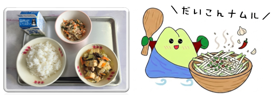 今日は「みそけんちん汁」が登場しました。けんちん汁の名前は、神奈川県にある建長寺(けんちょうじ)の修行僧が作った「建長汁」が転じたものと言われています。放送当番さんは「大根に味がしみて美味しかった」や「いわしはご飯が進んだ」と食レポをしていました!今日は体が温まる味でしたね\(^_^)/