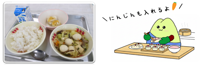 今日は、「多文化共生」の取組として室小学校の給食委員会さんが選んだ中華料理が登場です!全校児童に「どの国の料理が食べたいか」を聞いたところ、中国が一番人気だったそうです。放送当番さんの食レポでは、「中華どんぶりには、大好きなウズラの卵がたくさん入っていて嬉しかったです。他にもイカや野菜がモリモリ入っていて中国を感じながら食べることができました」とありました。にんじんシューマイはオレンジ色で見た目も華やかでしたね(^_-)