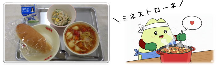 今日は、コッペパンに温かいミネストローネの洋風献立です。ミネストローネは、具材たっぷりの栄養満点スープです。放送当番さんからは、「貝がらみたいなパスタがめずらしかったです」とコメントがありましたね。ごまネーズあえに使われているごまは、カルシウムやビタミンE、食物繊維などが豊富です。しっかり食べて元気いっぱいの週末を迎えましょう(^o^)