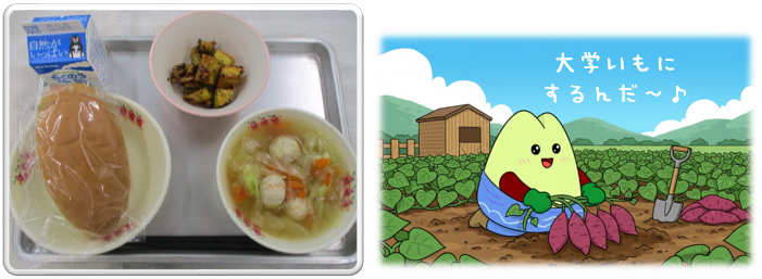 【本日の献立】★12月16日(火):コッペパン、大学芋、豆入り冬野菜スープ、牛乳