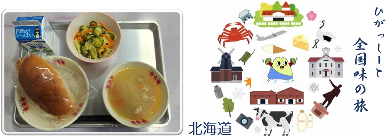 「全国学校給食週間」にちなんで、全国の米所を巡る「全国味の旅」 。今日は北海道の紹介です!どさんこスープ の「どさんこ」とは「北海道で生まれたもの」という意味があります 。北海道の名産である、バター、コーン、じゃがいも、そしてお味噌を使った、旨みたっぷりのスープです。北海道は寒くて稲作には向かない土地とされていましたが、寒い地域ならではの工夫を重ねた結果、今では美味しさのランキングでも常に上位に入るほどのお米の産地になったそうです(^^)/