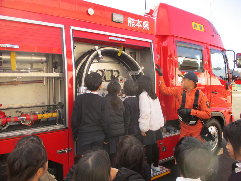 次に、消防車の見学をしました。消防車の機能と共に、消火の際のホースの準備等も教わりました。